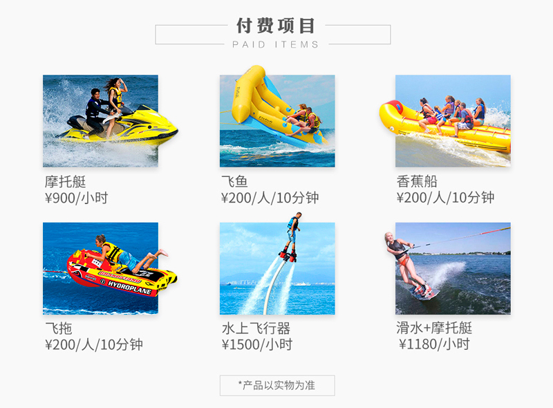 | 選配項目: | 摩托艇、飛魚、香蕉船、水上飛行器、飛拖、滑板 | ||||||